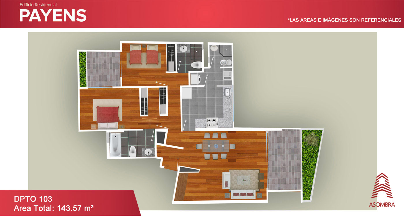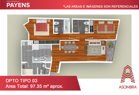 - Pisos típicos de 2 departamentos de 3 dormitorios por piso, 1 departamento de 2 dormitorios y